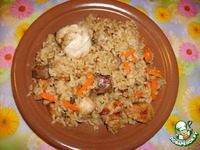 Рис промываем 7 РАЗ! (не меньше!) и добавляем к мясу, тщательно перемешивая, чтобы рис прожарился в масле до полупрозрачного состояния,