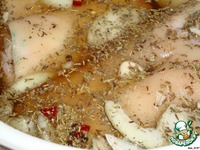 Добавить все специи : тимьян, орегано, тмин, майоран, розмарин, перец, лук - нарезанный полукольцами, чеснок - нарезанный крупно, соль. Оставить мариноваться в пиве на сутки в холодном месте. |