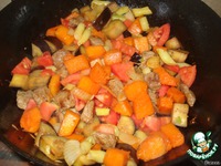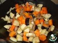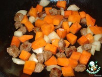 Когда мясо подрумянилось, добавляем в сковородку тыкву с луком. |
