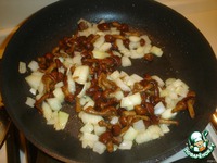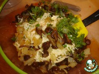 Лук обжарить на сковороде, добавить грибы. Обжарить. Добавить зелени. Слегка посолить, поперчить, можно добавить специи (итальянские травы) |
