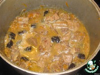 Наливаем бульон и накрываем крышкой. наше мяско должно потомиться минут 20. Потом мы добавляем к мясу чернослив и вино. закрываем и еще минут 25. |