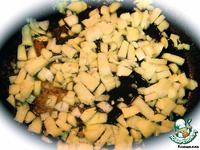 Пока тыква печется, нарезаем мелко лук и пассеруем в небольшом количестве вина (или бульона). Для этого лучше взять глубокий сотейник, так как готовить ризотто будем именно в нем. |
