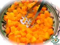 Для начала очищаем тыкву от семечек и кожуры и нарезаем небольшими квадратиками (1 - 1,5 см). Затем заворачиваем в фольгу и запекаем в духовке при 180 градусах примерно 30 мин. или до мягкости. |