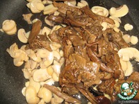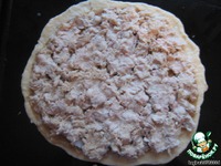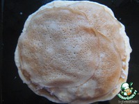 Теперь разделим тесто на две части - одна из них должна быть поменьше. Раскатаем меньшую часть и положим на смазанный маслом противень. Сверху плотно выложим слой блинчиков. |