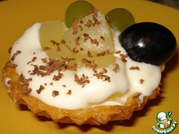 Для начинки тарталетки возьмем вначале 2 ложки крема, затем кусочки ананаса и еще раз по краю добавим сливки, после этого добавляем пару виноградин. |