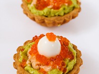 Уложить оба мусса в тарталетки. Сверху украсить яйцом и красной икрой. |