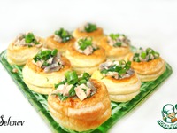 Волованы: Раскатать тесто в пласт толщиной 5 мм Стаканом вырезать круглые лепешки Половину их количества уложить на противень и смазать водой, проколоть вилкой в нескольких местах |