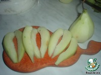 Берем груши (у меня было 3шт, одну берите с хвостиком), чистим от шкурки. Грушу с хвостиком откладываем в сторону, а остальные разрезать, удалить косточки. Я разрезала на 8 частей. |