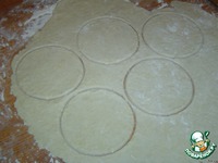 Раскатываем слоеное тесто, стаканом вырезаем круглые лепешки и распределяем их в смазанных маслом формочках. |