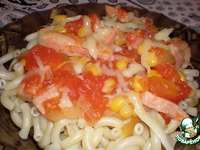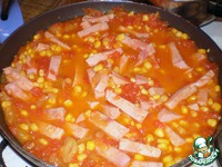Ветчину нарезать соломкой и вместе с консервированной кукурузой добавить с овощам. Положить лавровый лист и тушить на медленном огне еще 5 минут. |