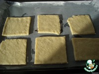 Тесто раскатать в пласт, сложить в несколько слоев и снова раскатать, так повторить 3 раза, затем разрезать на квадраты, переложить на смазанный противень. |