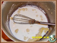 Добавляем 1/2 стак. молока и размешиваем венчиком, пока не получится однородная масса (кастрюля на плите - огонь маленький), затем добаляем еще (1 стакан) остальное молоко |