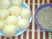 Приготовить ингредиенты для рецепта. Семечки измельчить в блендере или перемолоть с помощью дерев. молоточка. Очищенный картофель разрезать пополам, посолить. |