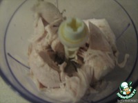 Пока пирожные остывают, готовим начинку №1: вареную куриную грудку измельчаем в блендере, |