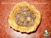 Также для начинки я брала консервированные жареные грибочки от свекрови но можна просто поджарить с лучком. И так на дно корзинки грибочки верх украшаем творожной начинкой. |