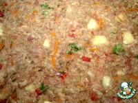 К фаршу добавить натертую на крупной терке морковь, мелконарезанную петрушку, яйца, сыр сулугуни, нарезанный кубиками. Посолить, поперчить по вкусу. Фарш тщательно перемешать. |