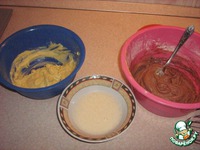 Взбить белки и разделить между мисками теста. |