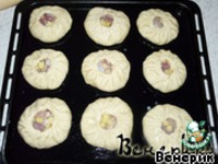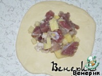 Разминаем ещё раз наше тесто, раскатываем маленькие лепёшечки размером с блюдце, кладём на середину фарш. |
