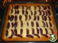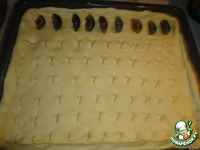 Когда тесто увеличится в 2-3 раза, перекладываем его в разъёмную форму с высокими бортиками. Теперь на нём делаем надрезы ножницами до дна. В полученные прорези вставляем сливы. |