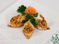Креветочным муссом наполнить листики-тарталетки. Украсить 2 креветками. |
