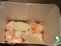 В чистый пакет складываем мясо, сверху кладем пару лавровых листочков. |