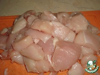 В чашке перемешиваем куриное мясо с желатином, чесноком (мелко измельченный), солим, перчим. |