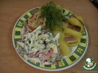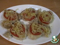 Далее. Отварное мясо (любое, какое есть в доме) нарезать на порционные кусочки. В моем случае - это предварительно отваренное мяско вместе с мясом на суп, вынутое из бульона (из бульона был прекрасно сварен суп!). Кусок мяса подсаливается по вкусу, перчится (можно приправить специями по вкусу), сверху на мяско положить кольцо свежего помидора. На помидор выложить обжаренный кольцами репчатый лук. Далее пойдут вариации по желанию: майонез, тертый сыр. В моем случае я остановилась только на обжаренном луке. |