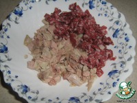 Вареную курицу также мелко нарезаем и смешиваем с колбасой. |