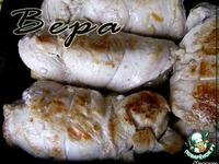 Завернуть филе рулетом. Обвязать нитками. Обжарить рулетики на растительном масле с обеих сторон. |