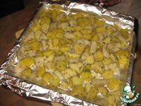Теперь берем противень (его можно и не застилать фольгой) и ровным слоем выкладываем на него картофель. |