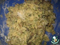 В готовое пюре добавляем яйца,измельченный укроп, вегетту и обжаренные грибочки и муки столько,чтобы получился плотный "фарш" для наших будущих биточков... |