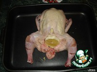 Сверху курицу натереть солью, внутрь положить разрезанный на 4 части лимон. Уложить ее на противень. |