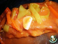 Для соуса - обжарить имбирь, чеснок, лук, не давая луку зарумяниться. Добавить сладкий перец, морковь и обжарить все вместе. |