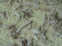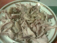 Окорочок отвариваем в специях (соль, перец черный, приправы для птицы и гранулированный чеснок). Готовый окорочок рвем на волокна. |