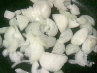 Тем временем готовим начинку. Лук режем полукольцами и обжариваем на растительном масле. |