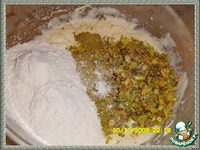 Муку, крахмал и разрыхлитель просеять. В кремообразную сливочную массу всыпать муку и молотые и рубленные фисташки, |