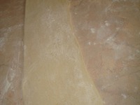 Приступаем к лепке нашего пирога. Из холодильника достаем тесто. Отрезаем небольшой кусочек от него, и раскатываем в длиную полосу. |