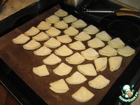 Снова складываем нашу половинку сахаром внутрь и макаем в сахар одну сторону. И выкладываем на противень сахаром вверх. |