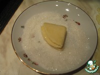 Потом складываем пополам наш кружок так, чтобы сторона, где сахар, была внутри. Берем нашу половинку и опять макаем в сахар одной стороной. |
