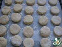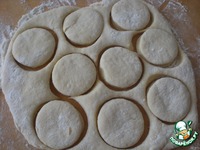 На доске, посыпанной мукой, раскатываем тесто толщиной 1-1,5 см и стаканом выдавливаем круги. |