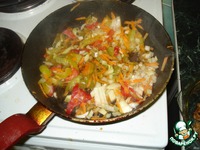 Обжарить на растительном масле лук, перец болгарский, морковь, добавить кетчуп, воду, соль, специи по вкусу. |