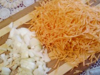 Лук порезать кусочками, морковь соломкой. Высыпать на разогретую сковородку, накрыть крышкой, потушить минут 5. |