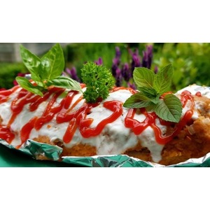 После этого фарш выкладываем на мокрое полотенце или на пленку, делаем из него лепешку, добавляем то, что у нас в сковороде и зеленый лук, заворачиваем так, чтобы начинка была внутри, а фарш сверху, как тесто для пирога. Пленку или полотенце нужно снять. Выкладываем на противень, смазываем сверху сметаной и в духовку на 20-25 мин. при температуре 200 гр.