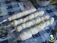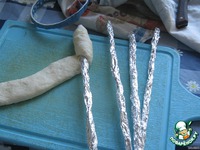 Поделить тесто на 4 части. Каждую скатать в колбаску и намотать на палочки. Я сделала их из больших деревянных палочек (для мини шашлыков), а сверху - фольга. Можно просто из фольги |