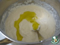 Добавить масло и кефир (можно больше 25 мл, тогда естественно больше уйдет муки) |