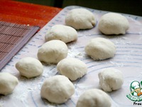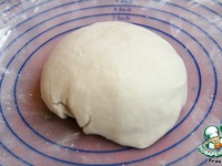 Переложить тесто на стол, вымесить 1-2 минуты. Сформировать шар и снова месить 1-2 минуты. И так не менее 5 раз - тесто не должно прилипать к не присыпанной мукой поверхности. Отбить тесто об стол, завернуть в пищевую пленку, поместить на 15 минут в теплое место. |