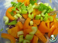 Остальные овощи моем чистим. Сельдерей и перец нарезаем небольшими кусочками и кладем поверх лука. |