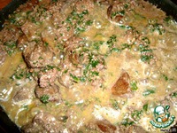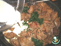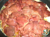 Обжарить кусочки печени на сливочном масле. Огонь должен быть сильным, чтобы лишняя жидкость выпарилась. Обжариваем 10-15 минут. |
