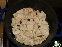 Теперь займёмся курочкой. Возьмите свежее филе курицы, промойте его под краном, обсушите салфеткой и нарежьте на небольшие кусочки. |