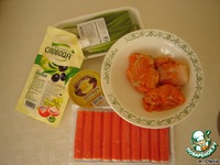 Берем 200 г форели, 200 г крабовых палочек, плавленный сыр, зеленый лук, майонез. |
